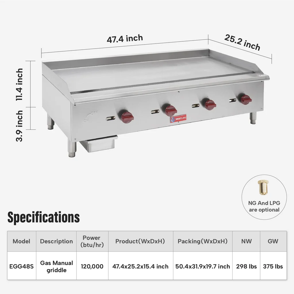 The WESTLAKE EGG-48S is a 48-inch countertop commercial gas griddle with 4 burners and 120,000 BTU output. Built with heavy-duty stainless steel, it delivers consistent, even heat across the entire cooking surface. Perfect for high-volume restaurants, food trucks, and catering operations