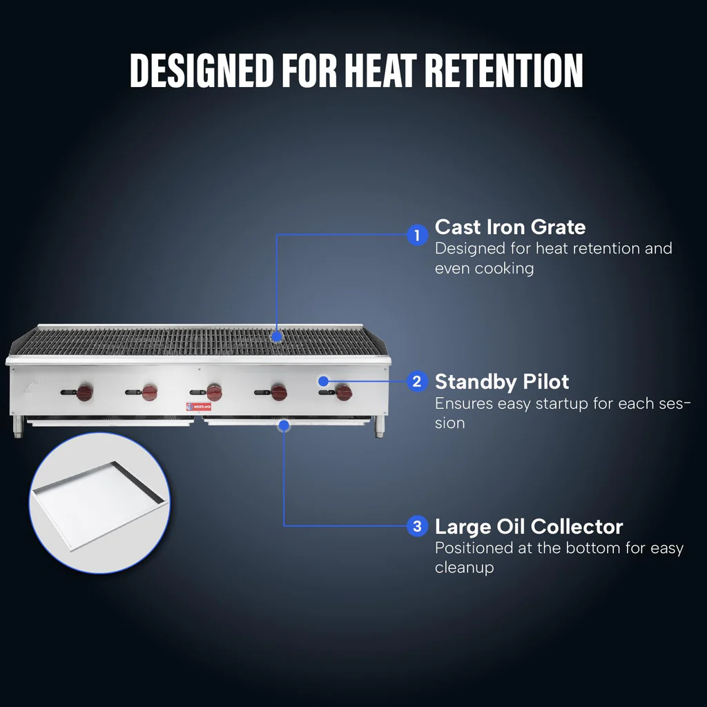 The WESTLAKE 60″ 5-Burner Commercial Gas Countertop Charbroiler is the ultimate high-output grilling solution for high-volume restaurants, steakhouses, and commercial kitchens. With 150,000 BTU total output, 5 powerful burners with radiant heat distribution, corrosion-resistant stainless steel construction, and superior heat retention, this ETL-certified charbroiler handles the most demanding professional cooking environments with ease.